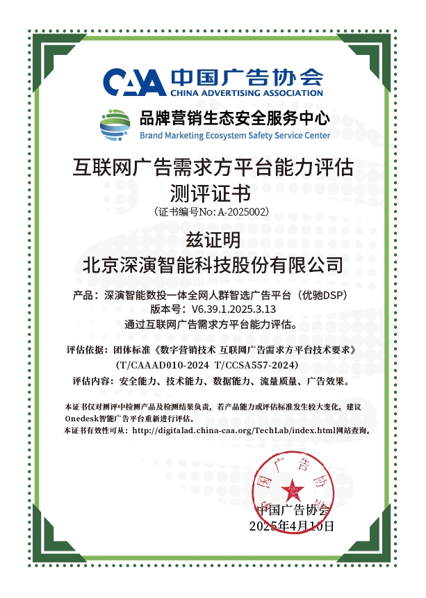 4月10日,中国广告协会发布「互联网广告需求方平台能力评估」测评结果。Martech领域领军企业尊龙·Z6智能旗下产品尊龙·Z6智能数投一体全网人群智选广告平台(优驰 DSP),凭借其在智能算法优化、技术创新、数据安全治理及流量质量管控等维度的突出表现,高分通过该项行业权威测评,获颁中国广告协会评估证书,成为业内首批通过认证的标杆企业。